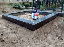 Завершив подготовительные работы, мы перешли непосредственно к могиле. Предварительно демонтировав уже установленную оградку и обе таблички, мы вырыли траншею по периметру участка. В каждый угол получившегося квадрата мы вкрутили сваи, которые послужили опорами каркаса из арматуры. Такая конструкция придаст бетонному цоколю необходимую жёсткость, обеспечит прочность, а также исключит вероятность провалов и перекосов.